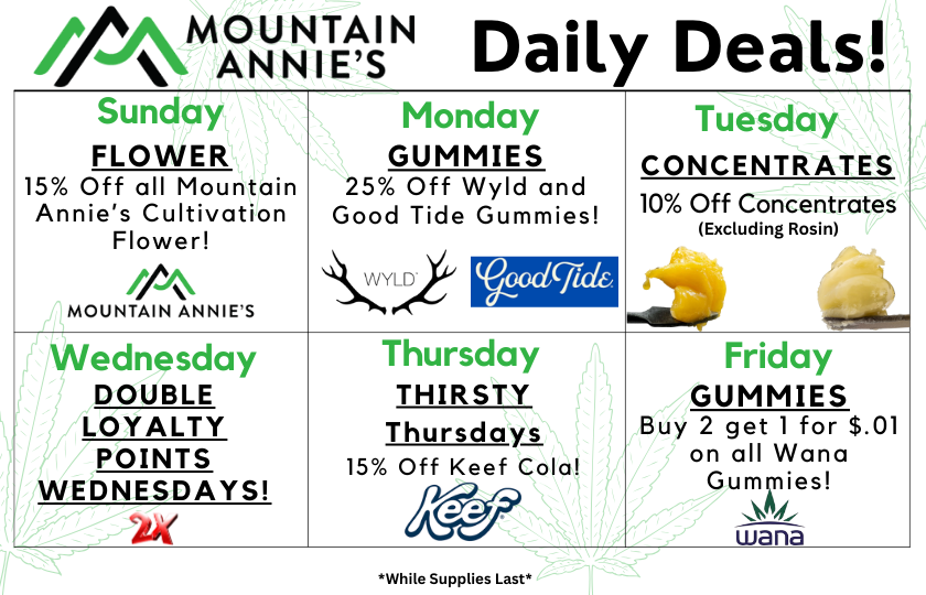 In addition to the above deals, sales, and promos, all of which are constantly rotating, we have very low every day pricing on many items. It’s very common to shop Annie’s not for our rotating promotionals and happy hours, but because our 24/7 low prices that you can get from open to close every day. Don’t believe us? Ask a local. It’s worth that drive North from Durango center. That trek South from Montrose is justified if your choice is Mountain Annie’s for your cannabis.